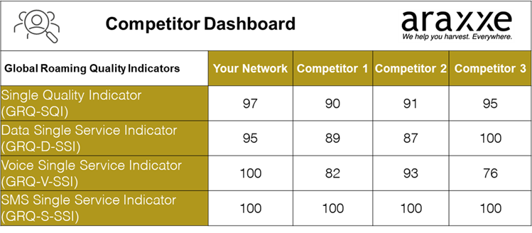 Araxxe helps operators unlock roaming competitor insights 17 March 2026 Category: Quality of Service Araxxe Roaming Quality of Service campaigns allow operators to benchmark their roaming performance in key destinations against their competitors. We produce KPIs aligned with GSMA GRQ standards, comparing your Quality of Service with that delivered by rival operators. This provides a clear view of where you stand in the market and helps drive corrective actions needed to reclaim the top spot. Would you like to discover more about Araxxe and how we can help optimize your roaming Quality of Service? Click here to set-up a meeting!