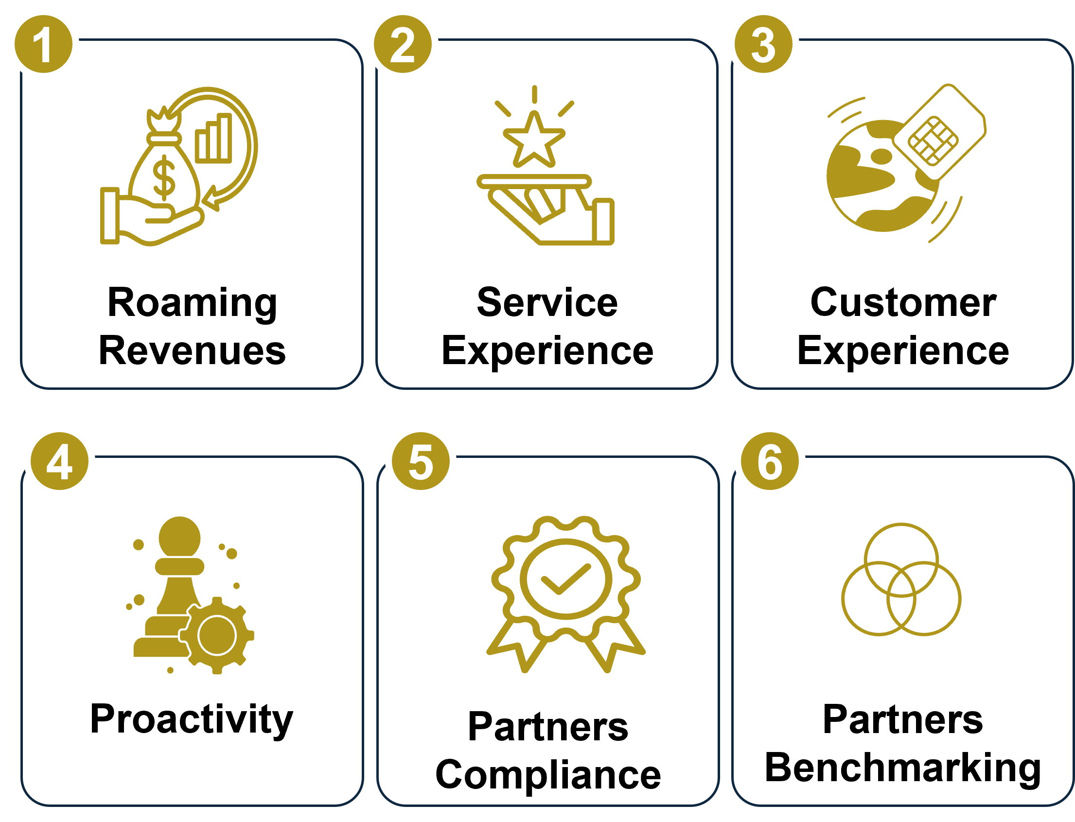 • Benchmarks of roaming partner performance supporting steering decisions.